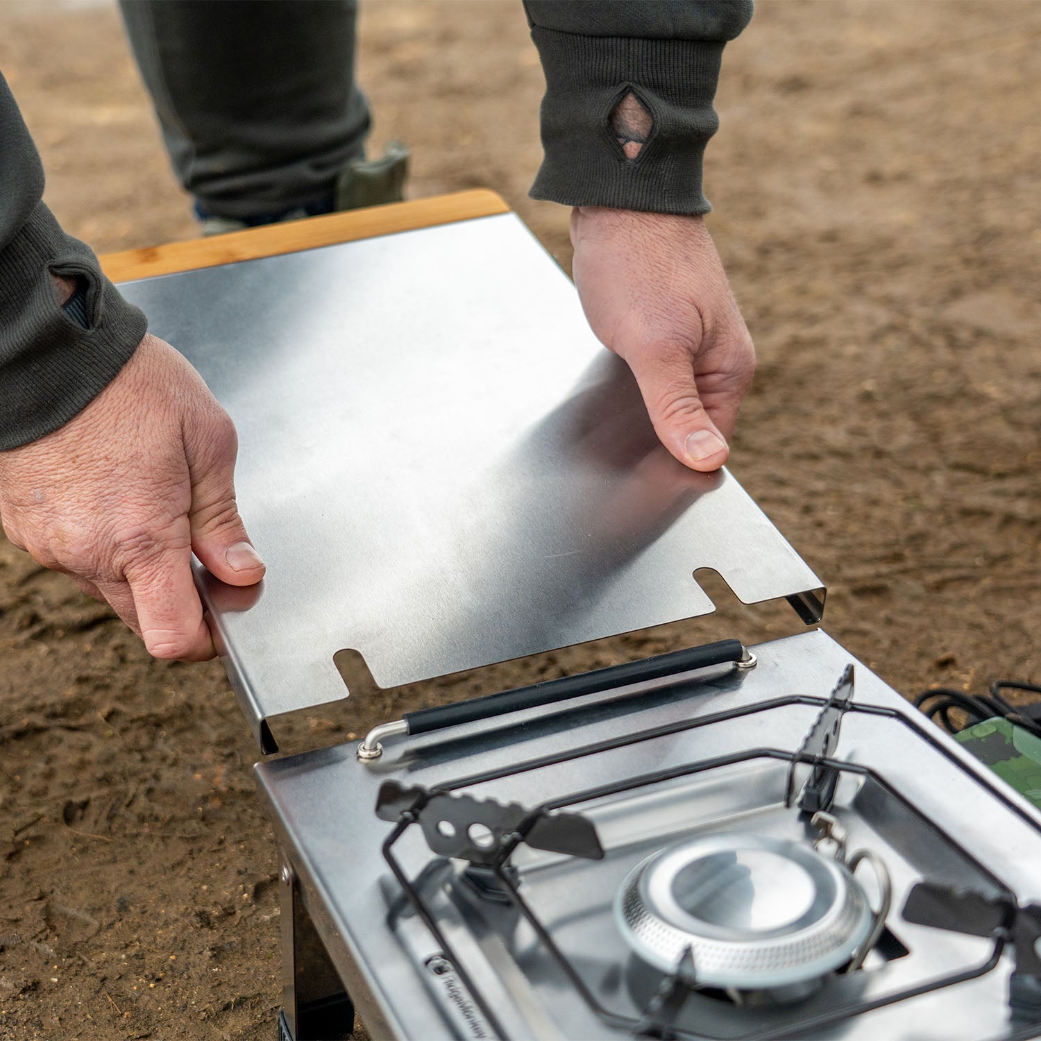 Un'interfaccia semplice e diretta presenta un semplice pulsante di accensione e una manopola di controllo del gas, che consentono di regolare con precisione la dimensione della fiamma (e quindi la temperatura) necessaria per una cottura precisa. Un tubo di preriscaldamento avvolge il bruciatore per garantire che l'unità funzioni in modo efficiente, soprattutto a basse temperature, ottimizzando la vaporizzazione del gas. Se combinato con il coperchio della bombola del gas riscaldato EcoPower USB (venduto separatamente), il gas viene riscaldato delicatamente per fornire un'efficienza ottimale del carburante, sfruttando al massimo ogni goccia, anche nelle condizioni più fredde. Ideali per l'uso su un tavolo, una panca o uno scaffale, i piedini in gomma sulle gambe pieghevoli aiutano l'unità a rimanere saldamente in posizione e a proteggere le superfici delicate. Un supporto per pentole con tappo in gomma assicura che le pentole rimangano sempre saldamente nella posizione ottimale, all'interno di una leccarda incassata facile da pulire. Le doppie maniglie con impugnatura in gomma sui lati consentono di spostare facilmente l'unità durante l'uso, pur essendo in grado di scorrere verso l'esterno o riporla ordinatamente quando non è necessaria. Un tavolino si inserisce semplicemente su entrambe le estremità della CookStation, a seconda delle preferenze e delle esigenze di spazio, offrendo una superficie estesa robusta, piana e pulita per la conservazione o la preparazione dei cibi.